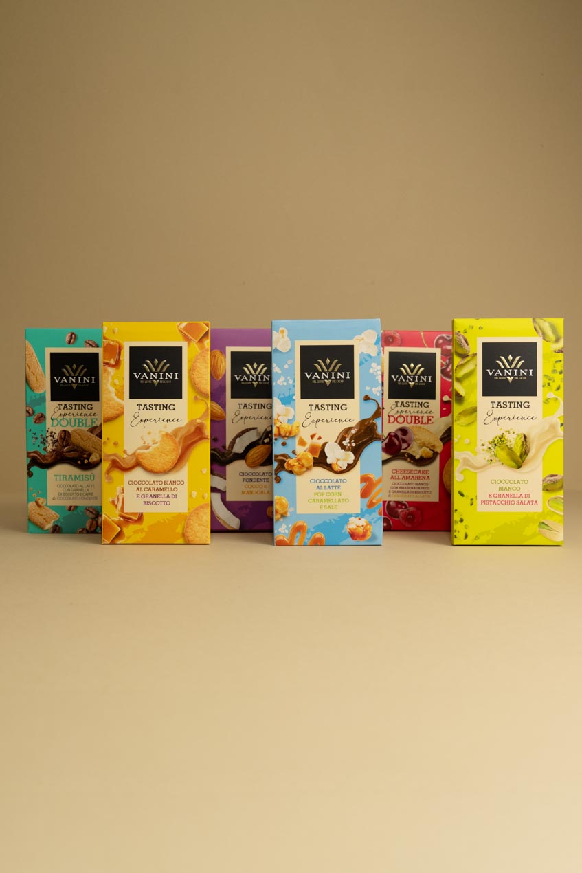 Per gli amanti di gusto e raffinatezza, Vanini presenta la sua ultima linea di Tavolette Tasting Experience: i 4 colori del cioccolato si sposano con ingredienti dalle vibranti consistenze, regalando contrasti di texture fra i più innovativi, per un’intenso piacere multilivello. Per questa linea, Vanini ha selezionato materie prime d’eccellenza, mixate per dar vita a contrasti sensoriali ogni volta nuovi e diversi, ma sempre sorprendenti.