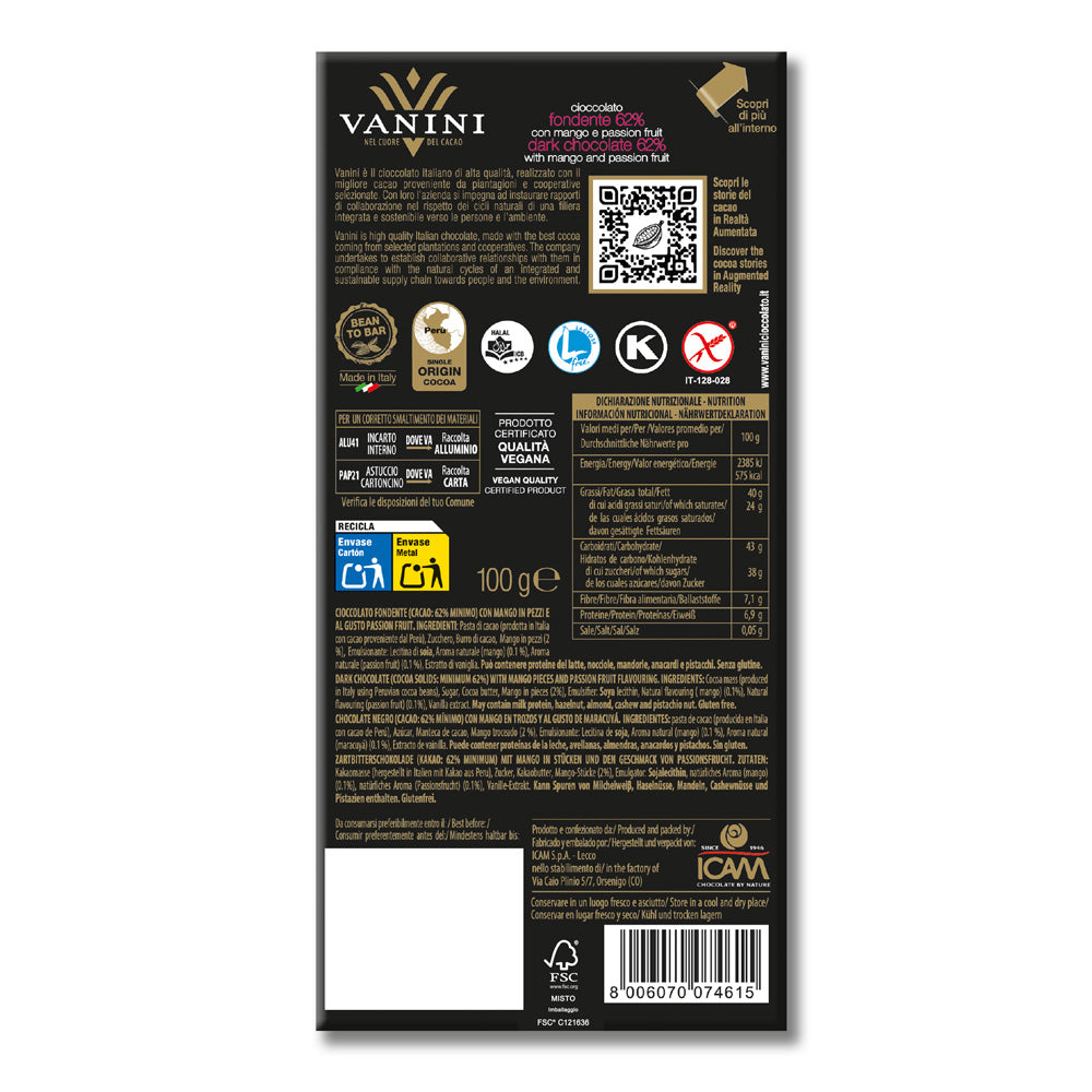 La Tavoletta di Cioccolato Fondente 62% Vanini Monorigine Perù con Mango e Passion Fruit offre un viaggio gustativo unico: le note fresche e dolci del mango si fondono con il profumo intenso e il gusto morbido del passion fruit, creando un equilibrio perfetto con il cacao peruviano.