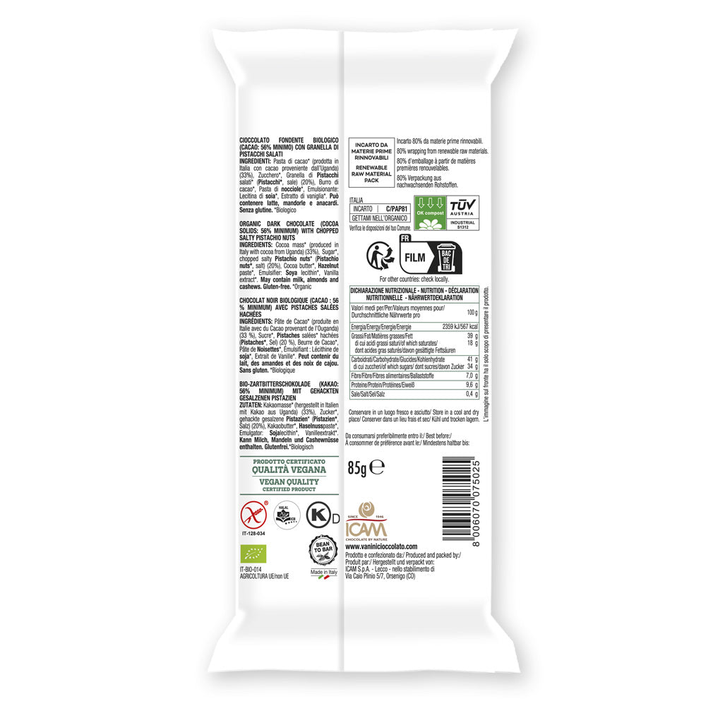 INGREDIENTI: Pasta di cacao* (prodotta in Italia con cacao proveniente dall’Uganda) (33%), Zucchero di canna*, Granella di Pistacchi salati* (Pistacchi, sale) (20%), Burro di cacao*, Pasta di nocciole*, Emulsionante: Lecitina di soia*, Estratto di vaniglia*. Può contenere tracce di latte e altra frutta a guscio. Senza glutine. *Biologico